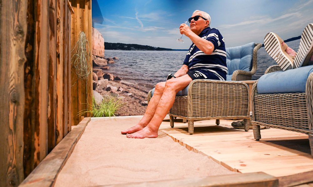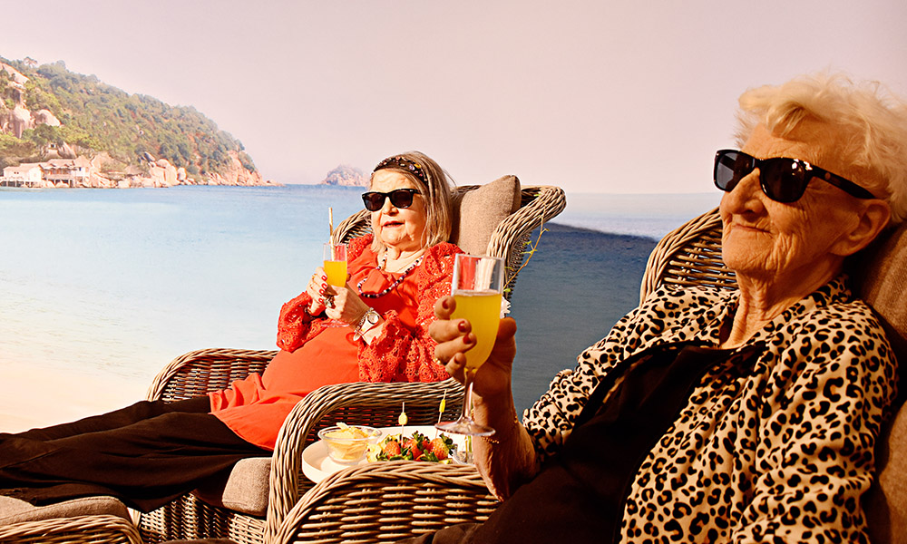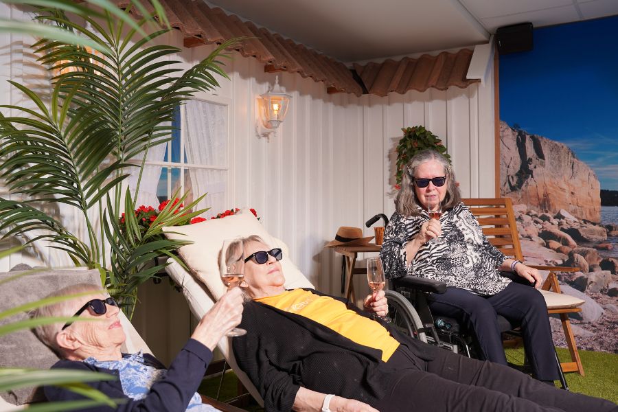 På Attendo Näsbyterrassen i Täby, kan man njuta av solen året runt. Vännerna Ines, Margareta och Pia älskar att koppla av i solrummet. Idag är de på plats i stolarna med lite bubbel i glaset, som de gör vid speciella dagar. Vinden fläktar behagligt i kombination med den heltäckande fondtapeten och värmelampan blir man snabbt förflyttad i fantasin till helt andra miljöer som ger associationer till sol, bad, hav och lata, sköna dagar.